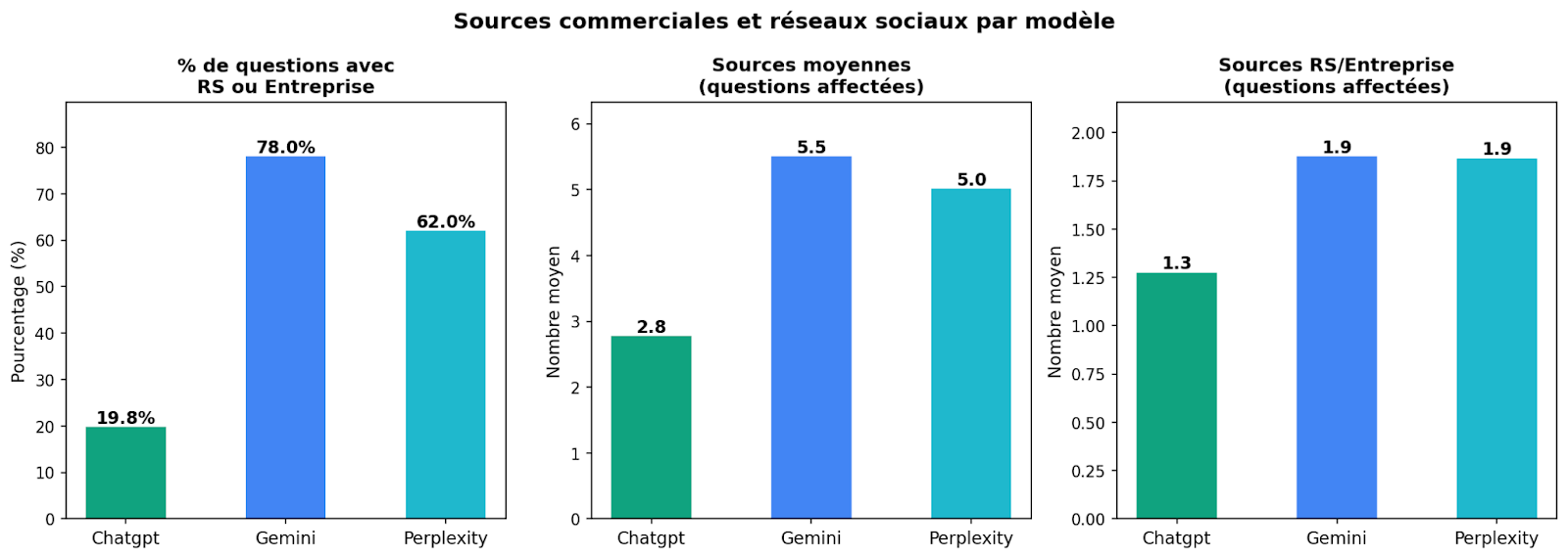 On remarque qu'environ une question sur cinq adressée à chatGPT mobilise au moins une source commerciale ou issue des réseaux sociaux (19.8%). Ce ratio est multiplié par près de quatre pour Gemini (78%) et par 3 pour Perplexity (62%). On pourrait supposer que ces sources fragiles se trouvent diluées parmi d'autres, plus rigoureuses. Les données suggèrent le contraire. Lorsqu'une question fait appel à au moins une source commerciale ou de réseau social, ces sources représentent en moyenne près de la moitié du total des sources mobilisées par ChatGPT (1.3 sur 2.8, soit 46%) et plus d’un tiers pour Gemini (1.9 sur 5.5, soit 35%) et Perplexity (1.9 sur 5.0, soit 39%).