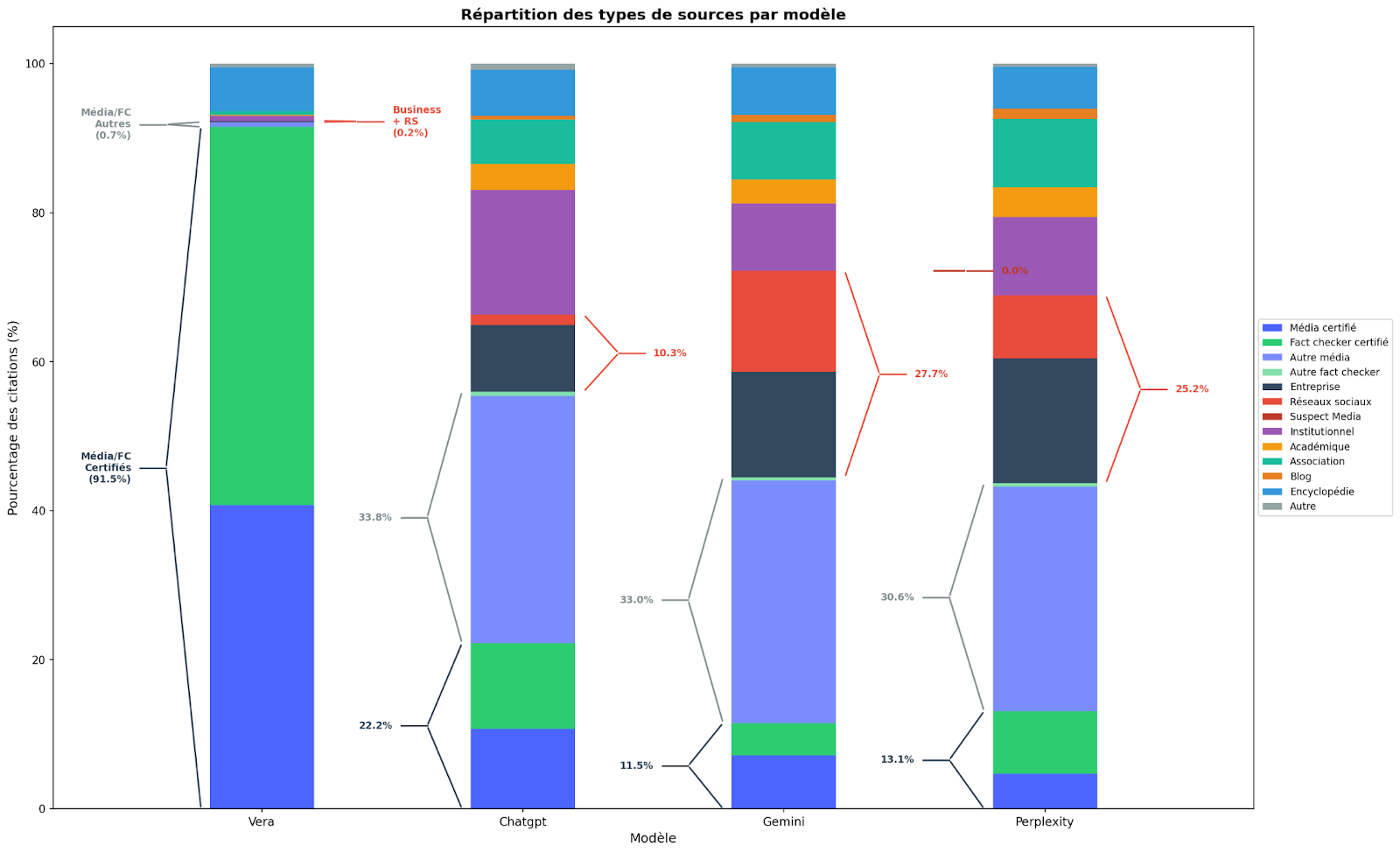 Contrairement aux principaux fournisseurs d'interface LLMs, Lareponse.tech, à l’origine de Vera, a pris la décision de ne citer que des sources qui respectent des critères précis. Pour les sources fact-checking les standards à respecter sont ceux de l’European Code of Standards for Independent Fact-Checking Organisations (EFCSN) ou du International Fact-Checking Network (IFCN). Pour les sources médias, nous nous appuyons sur la Journalism Trust Initiative (JTI), un outil de certification initié par Reporters sans frontières (RSF) qui évalue la transparence et le respect des standards d'éthique et de déontologie journalistiques. Nous prenons également en compte l'appartenance à des consortiums d'investigation reconnus, tels que Forbidden Stories (FS), les European Investigative Collaborations (EIC) ou l'International Consortium of Investigative Journalists (ICIJ). À partir de ces standards, les sources de médias fiables sont sélectionnées par notre comité d’experts. Cette approche garantit que Vera s'appuie exclusivement sur des sources dont la fiabilité a été préalablement évaluée et de limiter les problèmes liés aux hallucinations [17, 19].
